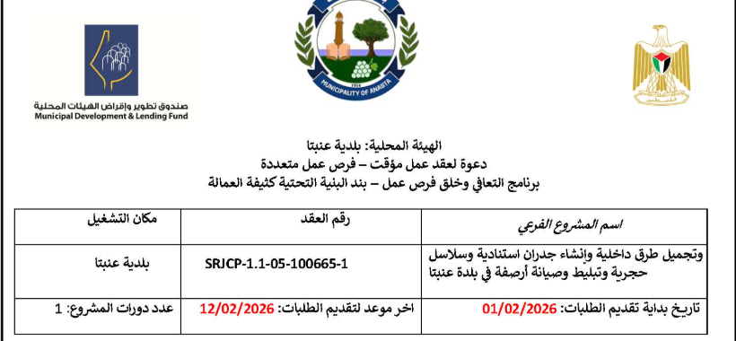 تعلن بلدية عنبتا عن طرح جملة من فرص العمل المؤقتة وذلك ضمن برنامج التعافي وخلق فرص عمل تحت بند البنية التحتية كثيفة العمال